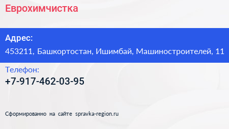 Еврохимчистка по адресу 453211, Башкортостан, Ишимбай, Машиностроителей, 11 в дальнейшем Организация, размещена в следующих категориях: