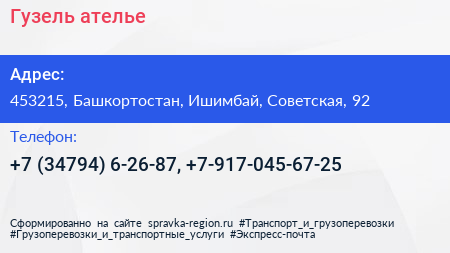 Гузель, ателье по адресу 453215, Башкортостан, Ишимбай, Советская, 92 в дальнейшем Организация, размещена в следующих категориях: