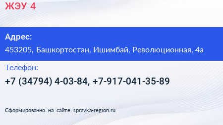 ЖЭУ-4 по адресу 453205, Башкортостан, Ишимбай, Революционная, 4а в дальнейшем Организация, размещена в следующих категориях: