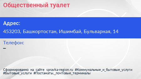 Общественный туалет по адресу 453203, Башкортостан, Ишимбай, Бульварная, 14 в дальнейшем Организация, размещена в следующих категориях: