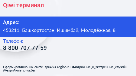 Qiwi, терминал по адресу 453211, Башкортостан, Ишимбай, Молодёжная, 8 в дальнейшем Организация, размещена в следующих категориях: