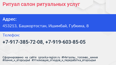 Ритуал, салон ритуальных услуг по адресу 453213, Башкортостан, Ишимбай, Губкина, 8 в дальнейшем Организация, размещена в следующих категориях: