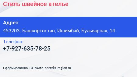 Стиль, швейное ателье по адресу 453203, Башкортостан, Ишимбай, Бульварная, 14 в дальнейшем Организация, размещена в следующих категориях: