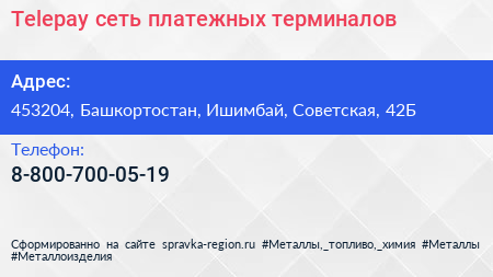 Telepay, сеть платежных терминалов по адресу 453204, Башкортостан, Ишимбай, Советская, 42Б в дальнейшем Организация, размещена в следующих категориях: