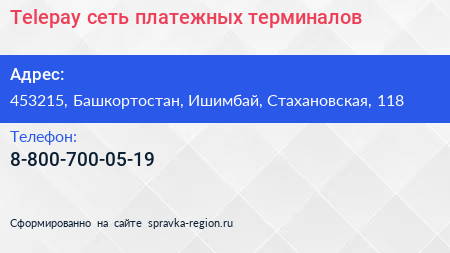 Telepay, сеть платежных терминалов по адресу 453215, Башкортостан, Ишимбай, Стахановская, 118 в дальнейшем Организация, размещена в следующих категориях:
