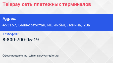 Telepay, сеть платежных терминалов по адресу 453167, Башкортостан, Ишимбай, Ленина, 23а в дальнейшем Организация, размещена в следующих категориях: