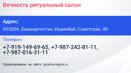 Вечность, ритуальный салон по адресу 453204, Башкортостан, Ишимбай, Советская, 40 в дальнейшем Организация, размещена в следующих категориях: