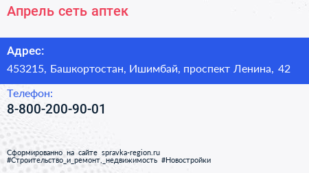 Апрель, сеть аптек по адресу 453215, Башкортостан, Ишимбай, проспект Ленина, 42 в дальнейшем Организация, размещена в следующих категориях: