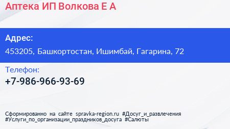 Аптека, ИП Волкова Е.А. по адресу 453205, Башкортостан, Ишимбай, Гагарина, 72 в дальнейшем Организация, размещена в следующих категориях: