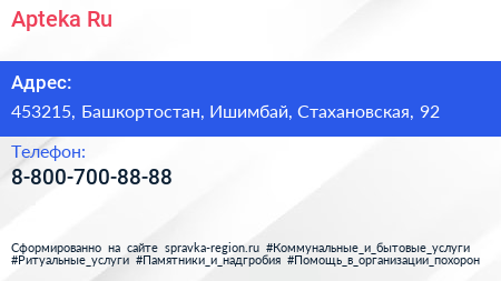 Apteka.Ru по адресу 453215, Башкортостан, Ишимбай, Стахановская, 92 в дальнейшем Организация, размещена в следующих категориях: