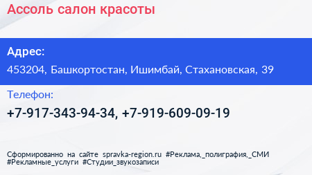 Ассоль, салон красоты по адресу 453204, Башкортостан, Ишимбай, Стахановская, 39 в дальнейшем Организация, размещена в следующих категориях: