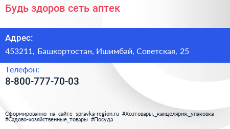 Будь здоров, сеть аптек по адресу 453211, Башкортостан, Ишимбай, Советская, 25 в дальнейшем Организация, размещена в следующих категориях: