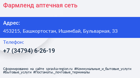 Фармленд, аптечная сеть по адресу 453215, Башкортостан, Ишимбай, Бульварная, 33 в дальнейшем Организация, размещена в следующих категориях:
