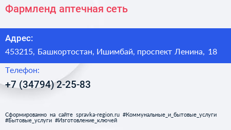 Фармленд, аптечная сеть по адресу 453215, Башкортостан, Ишимбай, проспект Ленина, 18 в дальнейшем Организация, размещена в следующих категориях: