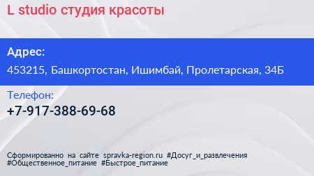 L-studio, студия красоты по адресу 453215, Башкортостан, Ишимбай, Пролетарская, 34Б в дальнейшем Организация, размещена в следующих категориях: