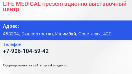 LIFE MEDICAL, презентационно-выставочный центр по адресу 453204, Башкортостан, Ишимбай, Советская, 42Б в дальнейшем Организация, размещена в следующих категориях: