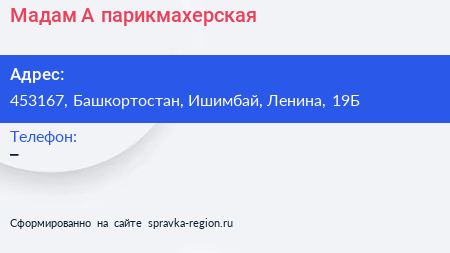 Мадам А, парикмахерская по адресу 453167, Башкортостан, Ишимбай, Ленина, 19Б в дальнейшем Организация, размещена в следующих категориях: