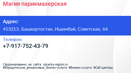 Магия, парикмахерская по адресу 453213, Башкортостан, Ишимбай, Советская, 64 в дальнейшем Организация, размещена в следующих категориях:
