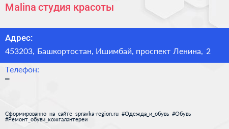 Malina, студия красоты по адресу 453203, Башкортостан, Ишимбай, проспект Ленина, 2 в дальнейшем Организация, размещена в следующих категориях: