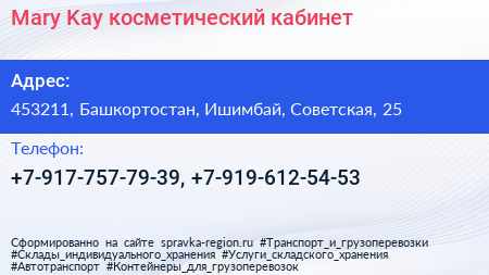 Mary Kay, косметический кабинет по адресу 453211, Башкортостан, Ишимбай, Советская, 25 в дальнейшем Организация, размещена в следующих категориях: