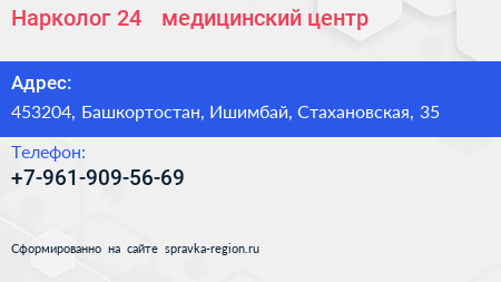 Нарколог 24 +, медицинский центр по адресу 453204, Башкортостан, Ишимбай, Стахановская, 35 в дальнейшем Организация, размещена в следующих категориях: