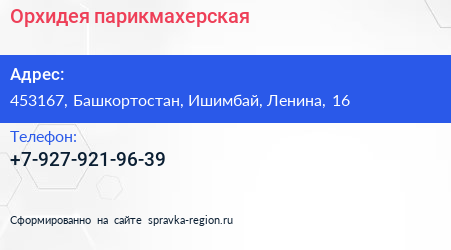 Орхидея, парикмахерская по адресу 453167, Башкортостан, Ишимбай, Ленина, 16 в дальнейшем Организация, размещена в следующих категориях: