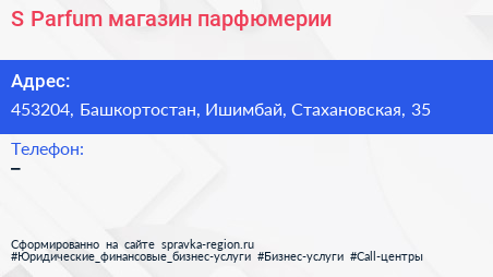S-Parfum, магазин парфюмерии по адресу 453204, Башкортостан, Ишимбай, Стахановская, 35 в дальнейшем Организация, размещена в следующих категориях:
