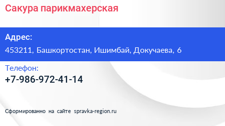 Сакура, парикмахерская по адресу 453211, Башкортостан, Ишимбай, Докучаева, 6 в дальнейшем Организация, размещена в следующих категориях: