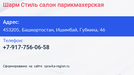 Шарм-Стиль, салон-парикмахерская по адресу 453205, Башкортостан, Ишимбай, Губкина, 46 в дальнейшем Организация, размещена в следующих категориях: