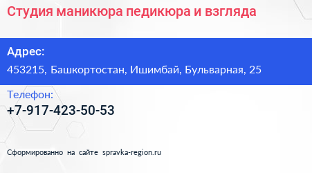 Студия маникюра, педикюра и взгляда по адресу 453215, Башкортостан, Ишимбай, Бульварная, 25 в дальнейшем Организация, размещена в следующих категориях: