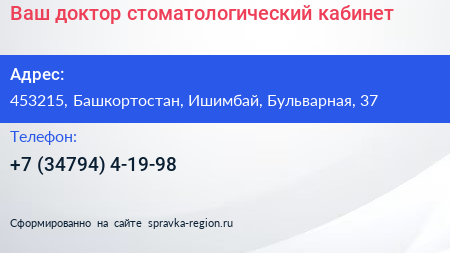 Ваш доктор, стоматологический кабинет по адресу 453215, Башкортостан, Ишимбай, Бульварная, 37 в дальнейшем Организация, размещена в следующих категориях:
