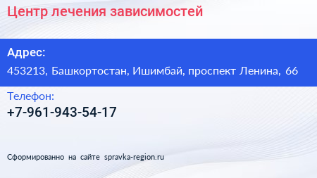 Центр лечения зависимостей по адресу 453213, Башкортостан, Ишимбай, проспект Ленина, 66 в дальнейшем Организация, размещена в следующих категориях:
