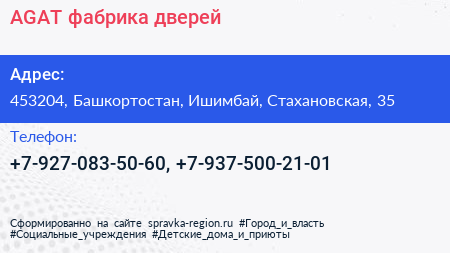 AGAT, фабрика дверей по адресу 453204, Башкортостан, Ишимбай, Стахановская, 35 в дальнейшем Организация, размещена в следующих категориях: