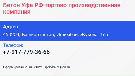 Бетон-Уфа.РФ, торгово-производственная компания по адресу 453204, Башкортостан, Ишимбай, Жукова, 16а в дальнейшем Организация, размещена в следующих категориях: