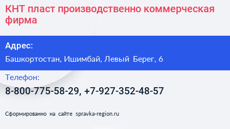 КНТ-пласт, производственно-коммерческая фирма по адресу Башкортостан, Ишимбай, Левый Берег, 6 в дальнейшем Организация, размещена в следующих категориях: