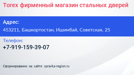 Torex, фирменный магазин стальных дверей по адресу 453211, Башкортостан, Ишимбай, Советская, 25 в дальнейшем Организация, размещена в следующих категориях: