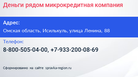 Деньги рядом, микрокредитная компания по адресу Омская область, Исилькуль, улица Ленина, 88 в дальнейшем Организация, размещена в следующих категориях: