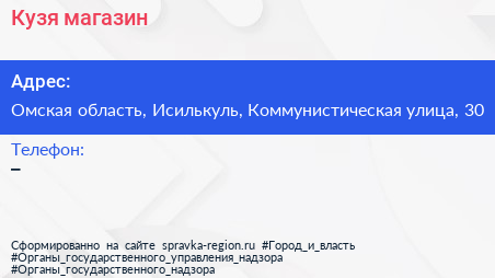 Кузя, магазин по адресу Омская область, Исилькуль, Коммунистическая улица, 30 в дальнейшем Организация, размещена в следующих категориях: