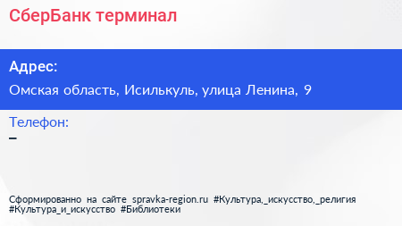 СберБанк, терминал по адресу Омская область, Исилькуль, улица Ленина, 9 в дальнейшем Организация, размещена в следующих категориях: