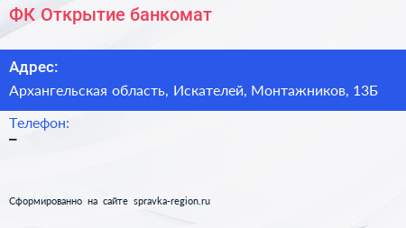 ФК Открытие, банкомат по адресу Архангельская область, Искателей, Монтажников, 13Б в дальнейшем Организация, размещена в следующих категориях: