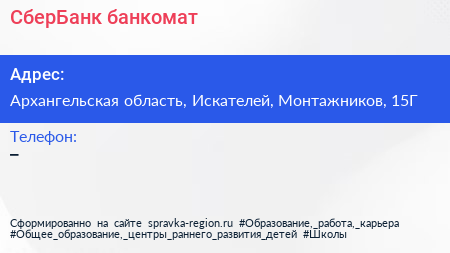 СберБанк, банкомат по адресу Архангельская область, Искателей, Монтажников, 15Г в дальнейшем Организация, размещена в следующих категориях: