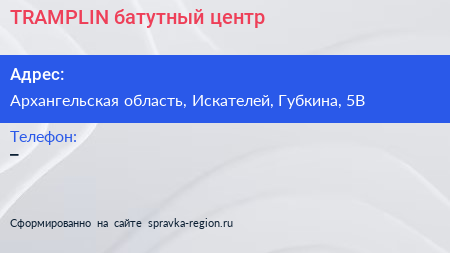 TRAMPLIN, батутный центр по адресу Архангельская область, Искателей, Губкина, 5В в дальнейшем Организация, размещена в следующих категориях: