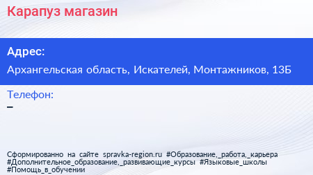 Карапуз, магазин по адресу Архангельская область, Искателей, Монтажников, 13Б в дальнейшем Организация, размещена в следующих категориях: