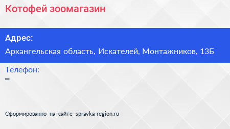 Котофей, зоомагазин по адресу Архангельская область, Искателей, Монтажников, 13Б в дальнейшем Организация, размещена в следующих категориях: