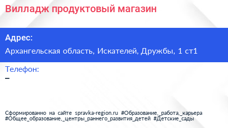 Вилладж, продуктовый магазин по адресу Архангельская область, Искателей, Дружбы, 1 ст1 в дальнейшем Организация, размещена в следующих категориях: