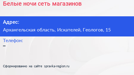 Белые ночи, сеть магазинов по адресу Архангельская область, Искателей, Геологов, 15 в дальнейшем Организация, размещена в следующих категориях: