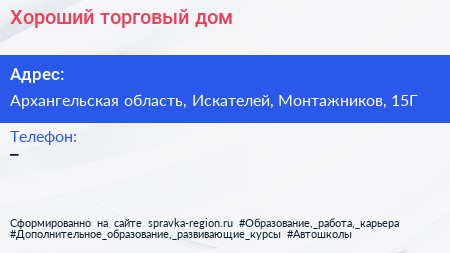 Хороший, торговый дом по адресу Архангельская область, Искателей, Монтажников, 15Г в дальнейшем Организация, размещена в следующих категориях: