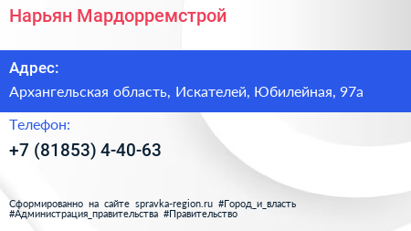 Нарьян-Мардорремстрой по адресу Архангельская область, Искателей, Юбилейная, 97а в дальнейшем Организация, размещена в следующих категориях:
