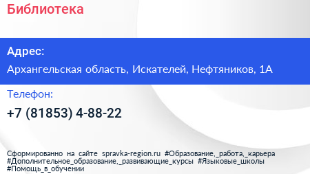 Библиотека по адресу Архангельская область, Искателей, Нефтяников, 1А в дальнейшем Организация, размещена в следующих категориях: