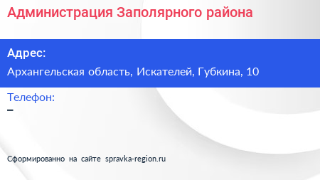 Администрация Заполярного района по адресу Архангельская область, Искателей, Губкина, 10 в дальнейшем Организация, размещена в следующих категориях: